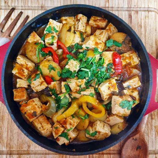 Receita: previamente cortar o tofu em cubinhos e deixar em vinho, molho de soja, alho esmagado, sal e pimenta durante 1 hora. Cortar em rodelas a cebola e picar o alho. Alourar na panela com o louro e azeite. Pelar e picar o tomate e cozinhar juntando os orégãos o sal e o açúcar durante 10m. Cortar os pimentos em rodelas e juntar. Cortar as rodelas com casca a batata e colocar na panela, Juntar o preparado de tofu com o líquido de tempero. Picar meio ramo de coentros e juntar. Misturar as folhas nori até amolecerem e deixar cozinhar durante 25/35m (ir vendo a batata) a meio da cozedura retirar as algas e temperar a gosto com pimentão doce, pimenta, levedura nutricional etc.