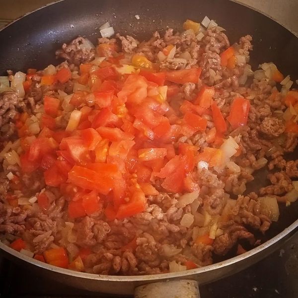 3. Deixar refogar um pouco e depois adicionar o picado vegetal, os dois tomates picados, a pasta de tomate, o vinho e a água.