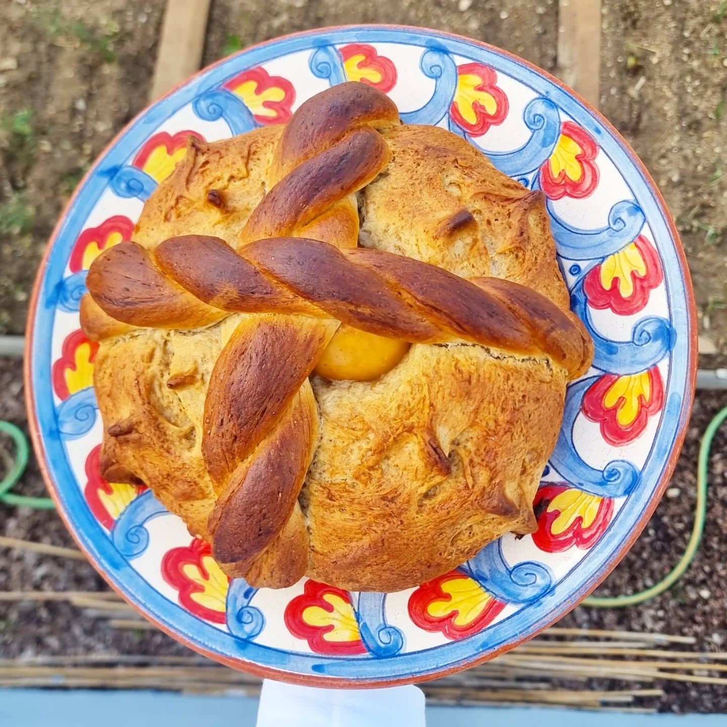 Com as 100 g de massa reservada: separa-a em duas partes e faz duas tiras em trança, coloca-as sobre a bola de massa e da maçã fazendo um x.