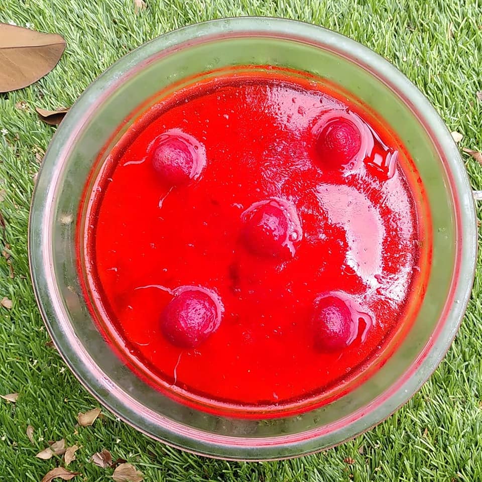 Aquecer gelatina de frutos tropicais e repetir o processo até solidificar.