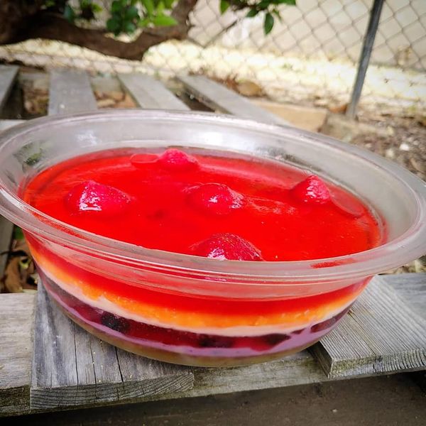 Fazer a gelatina de frutos vermelhos e verter na taça por cima da última camada. Deixar arrefecer e colocar no frigorífico até solidificar.