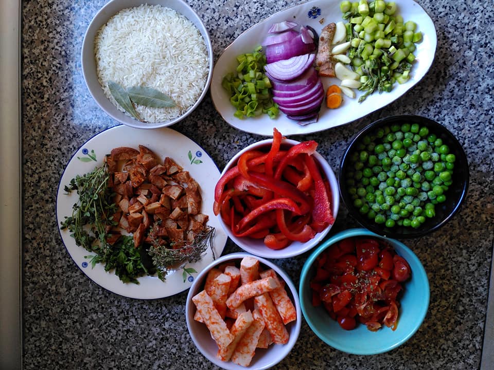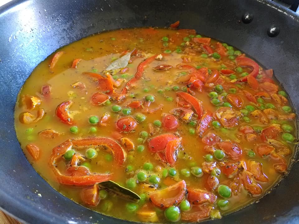 Adicione à mesma frigideira os pimentos em tiras, o tomate aos cubos e ar ervilhas. Deixe cozinhar mais alguns minutos. Junte o arroz, o vinho o açafrão, envolva bem e junte o dobro da água da medida de arroz. Tempere com sal, pimenta, cebola em pó, levedura nutricional.
