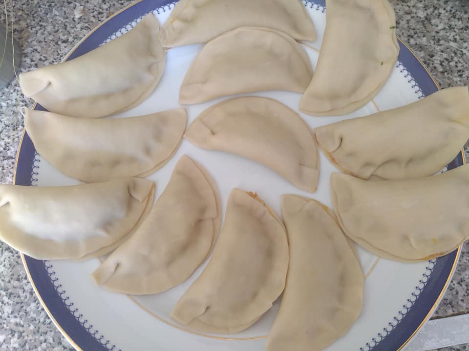 Corta rodelas de massa, coloca o recheio no meio (uma colher de sobremesa), pincela os bordos da massa com um pouco de água e fecha o pastel de massa tenra leva a fritar em óleo ou ao forno.