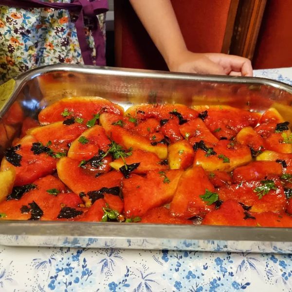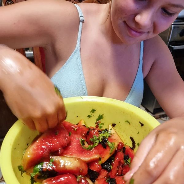 Eu e a Lia pegámos em meia melancia pequena e contámos aos pedaços.