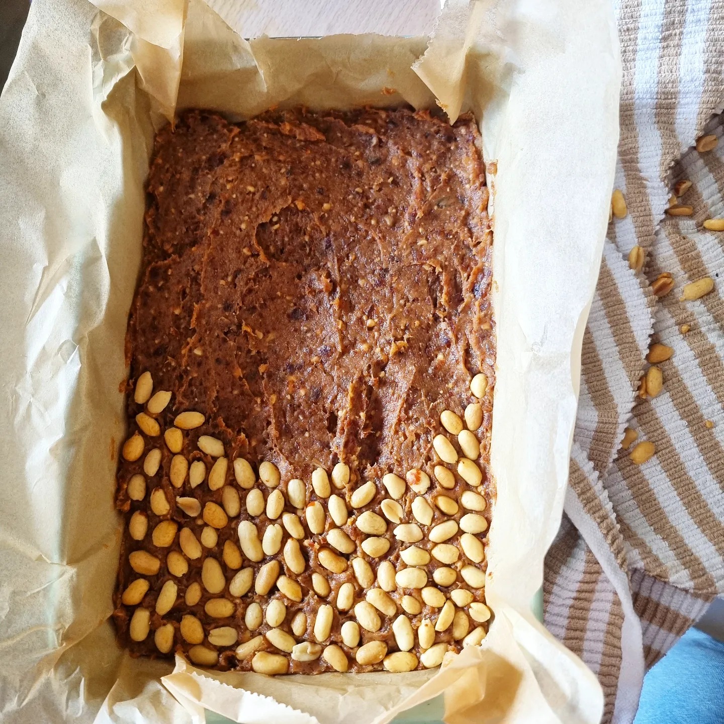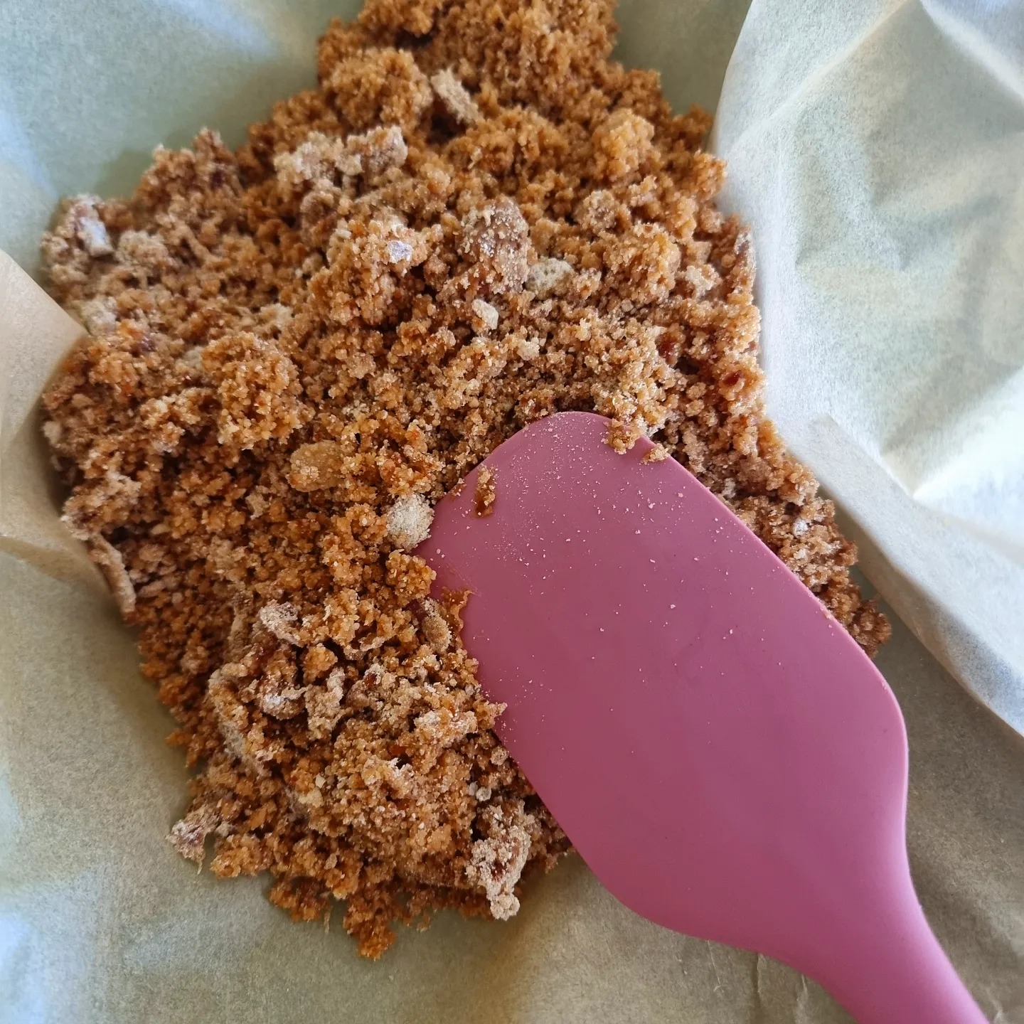 Para a base usar 1/4 do caramelo, farinha de aveia integral e farinha de amêndoa. Misturar com ajuda de uma espátula e depois numa travessa com papel vegetal pressionar para fazer a base.