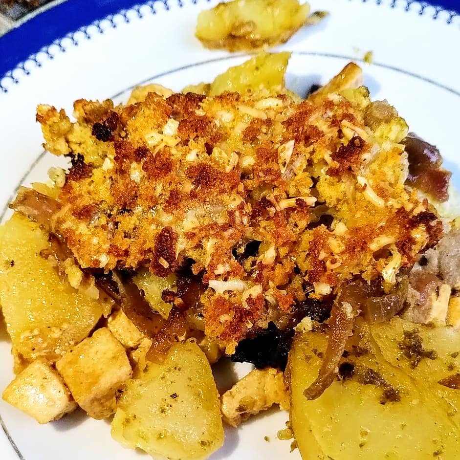 Num tabuleiro colocar uma camada de cebola. Uma camada de batatas. Algumas colheres do Queijo fresco. Outra de batatas. Outra de cebola. Uma de tofu. Outra de batatas e finalmente a crosta de broa.