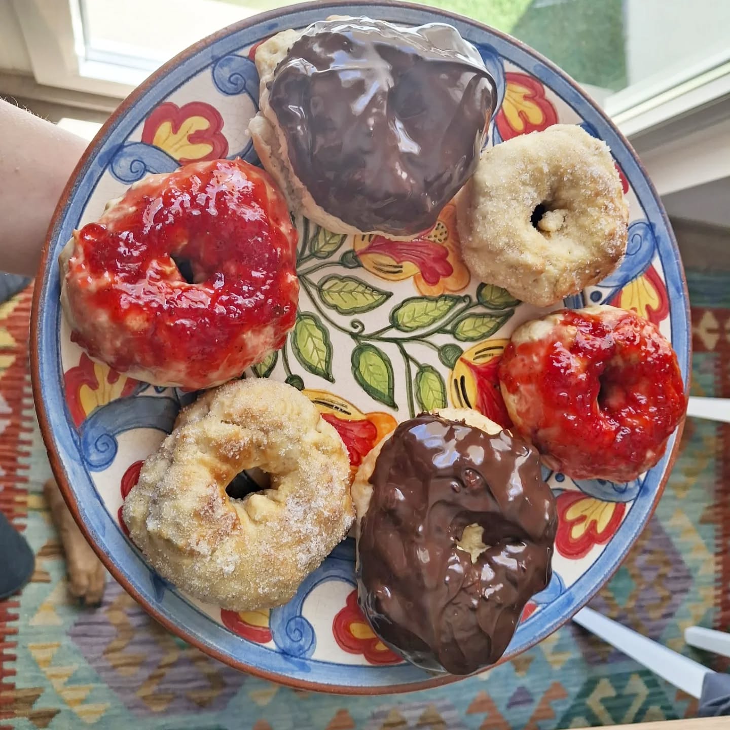 Canela e açúcar (derreter manteiga e pincelar os donuts e depois com ajuda de um prato passar no açúcar e canela