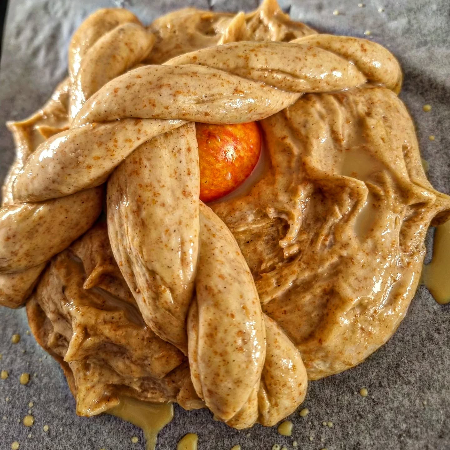 Entretanto prepara a calda: mistura a geleia com a bebida vegetal. Antes de levar ao forno pincela todo o folar, incluíndo a maçã (apenas a parte visível).