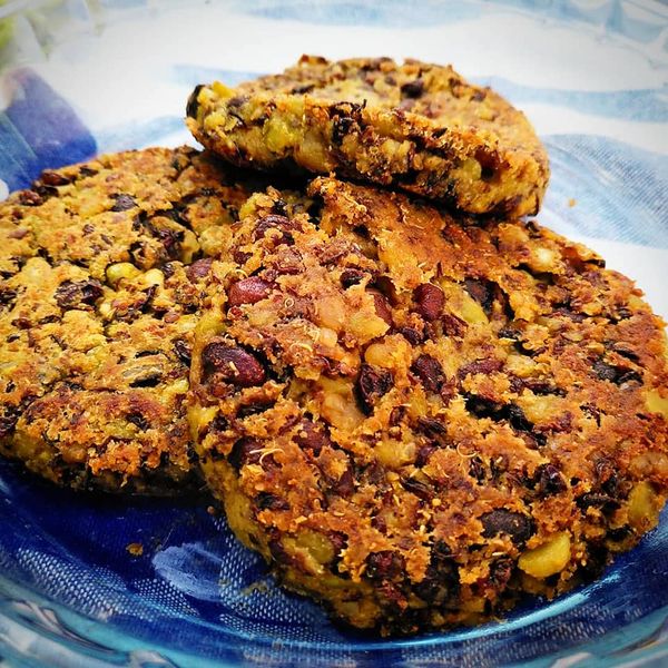 Num recipiente grande misturar o feijão, a restante ervilha, duas colheres grandes de quinoa, a farinha de milho, azeite e temperos a gosto. Esmagar com as mãos e fazer os discos. Dá para uns 6/8