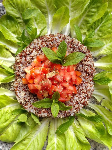 Cozer o trigo sarraceno e a quinoa durante 30m (dois de água para uma de cereais) com sal e hortelã. Até desaparecer a água. Reservar
