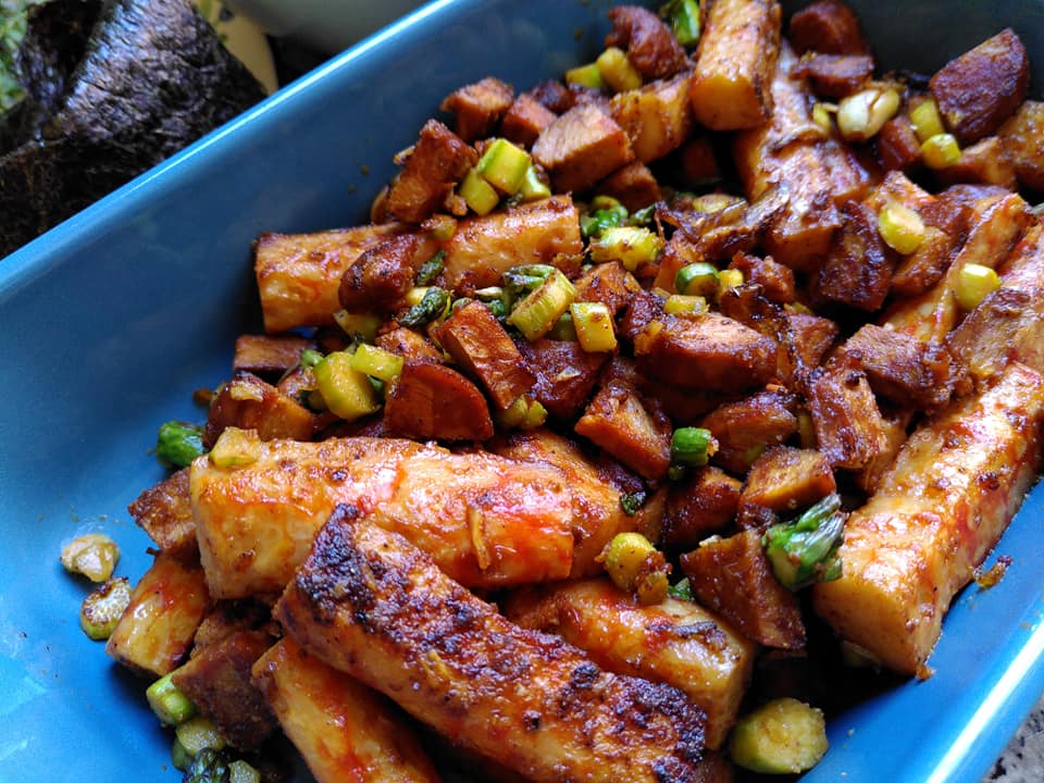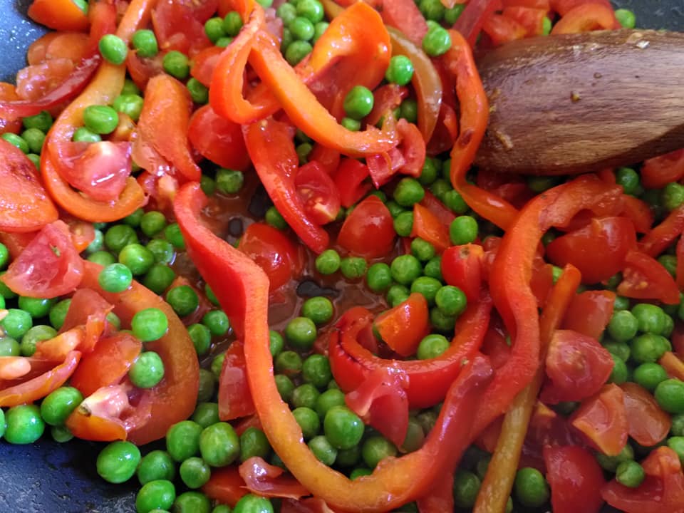 Adicione à mesma frigideira os pimentos em tiras, o tomate aos cubos e ar ervilhas. Deixe cozinhar mais alguns minutos. Junte o arroz, o vinho o açafrão, envolva bem e junte o dobro da água da medida de arroz. Tempere com sal, pimenta, cebola em pó, levedura nutricional.