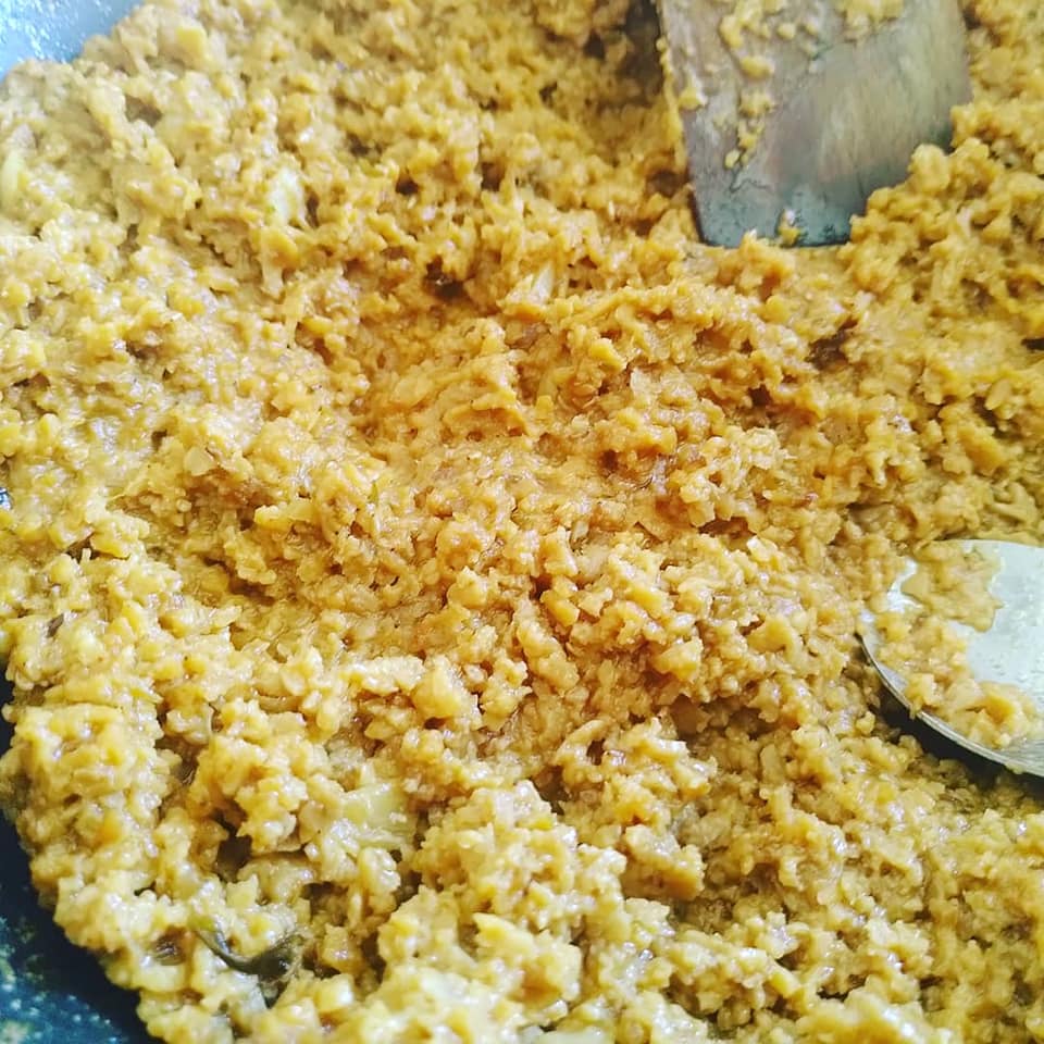 Numa frigideira saltear a soja e fritar bem com alho. Juntar a aveia e as sementes e deixar cozinhar até secar e tostar um pouco. Juntar os temperos e envolver bem.
