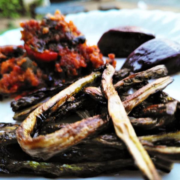 Descascar e cortar a beringela. Cozer em água e sal por 35 m. Depois passar por água fria e temperar a gosto com azeite e sal.