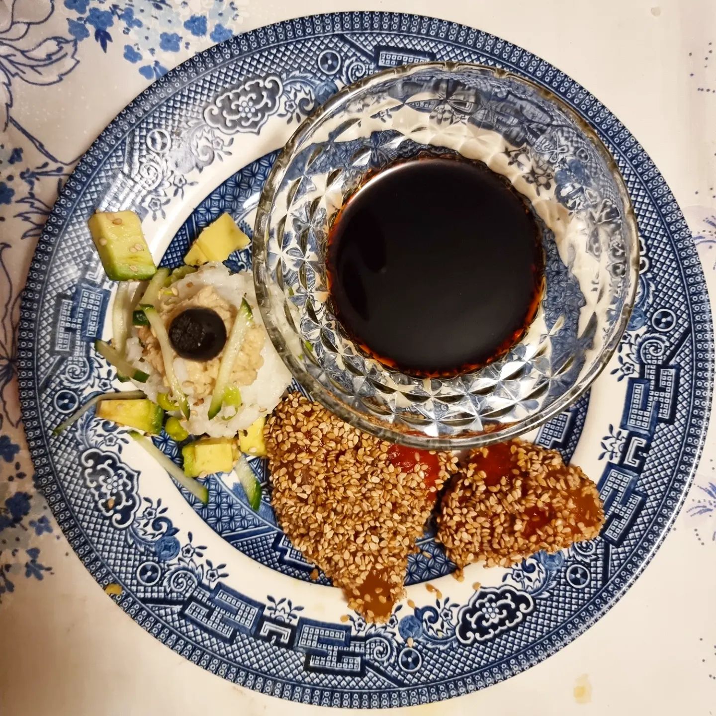 Servi com bolas de arroz de ervilhas, com vuna e uma rodela de azeitona preta por cima. Com um toque de pepino e abacate também muito bom para sushi (tal como a manga o morango o queijo vegan fresco de barrar ou mesmo tofu).