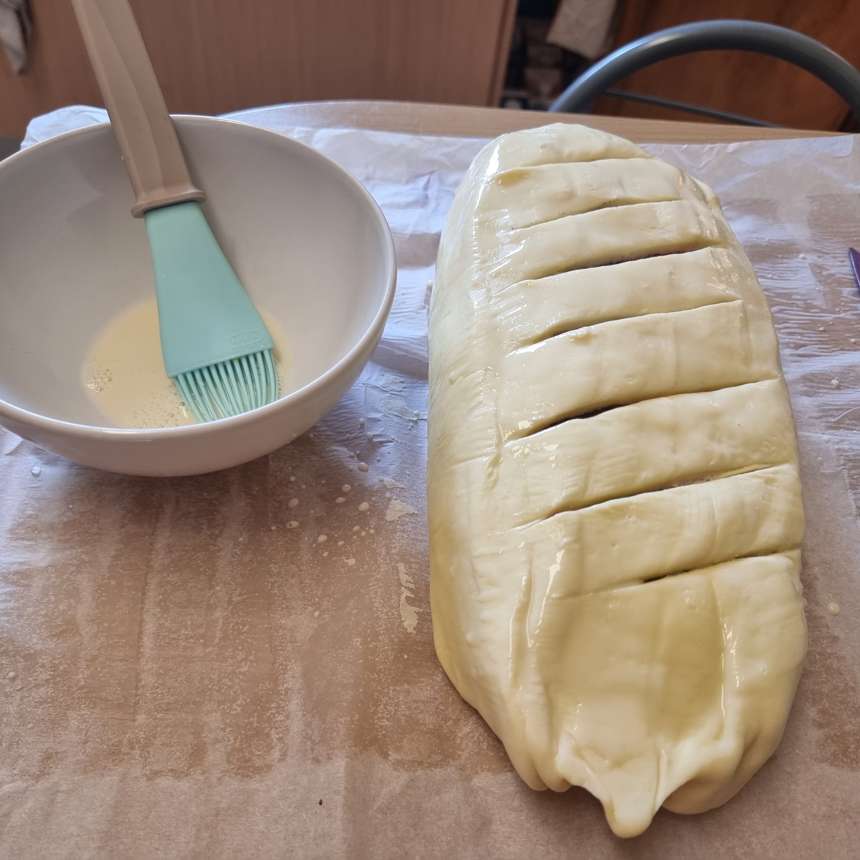 Estender 2 massas folhada lado a lado e colocar os rolos de "carne" em cima. Depois colocar os cogumelos e fechar ambos wellington. Com as outras 2 massas voltar a embrulhar. Dar uns golpes e pincelar com leite vegetal para ganhar cor e levar 30m a 180º no forno pré-aquecido.
