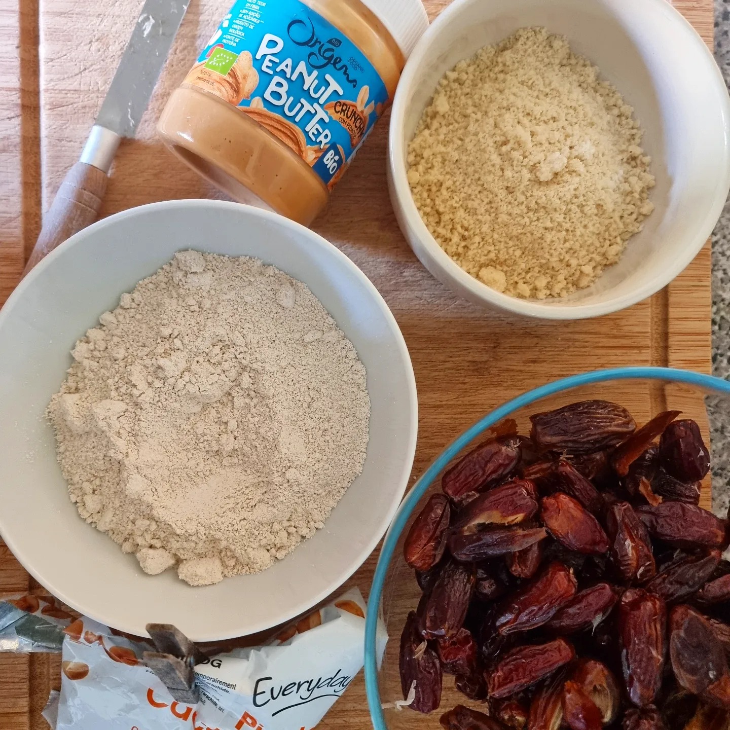Primeiro descaroçar e hidratar as tâmaras com água quente durante 10m.