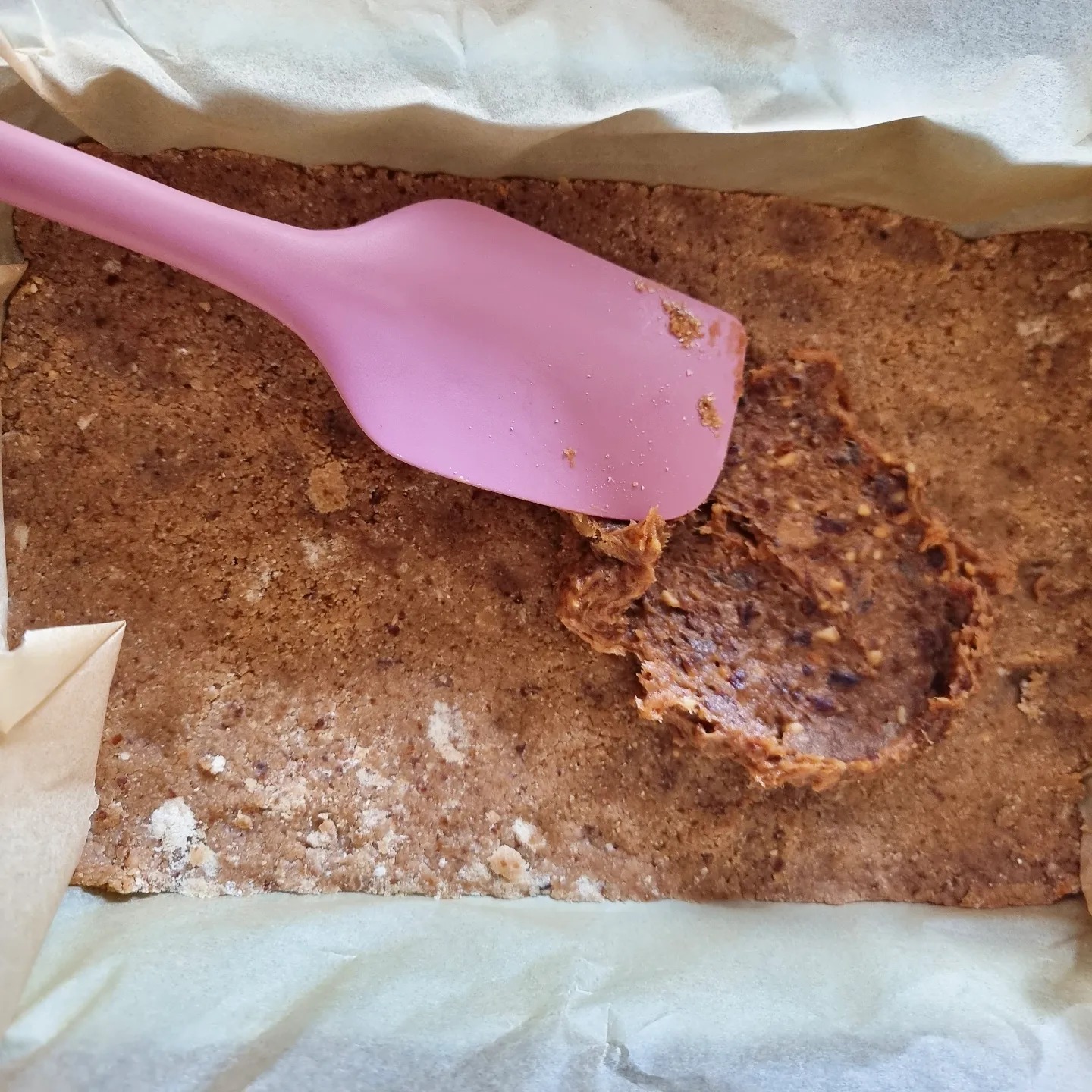 Para a base usar 1/4 do caramelo, farinha de aveia integral e farinha de amêndoa. Misturar com ajuda de uma espátula e depois numa travessa com papel vegetal pressionar para fazer a base.