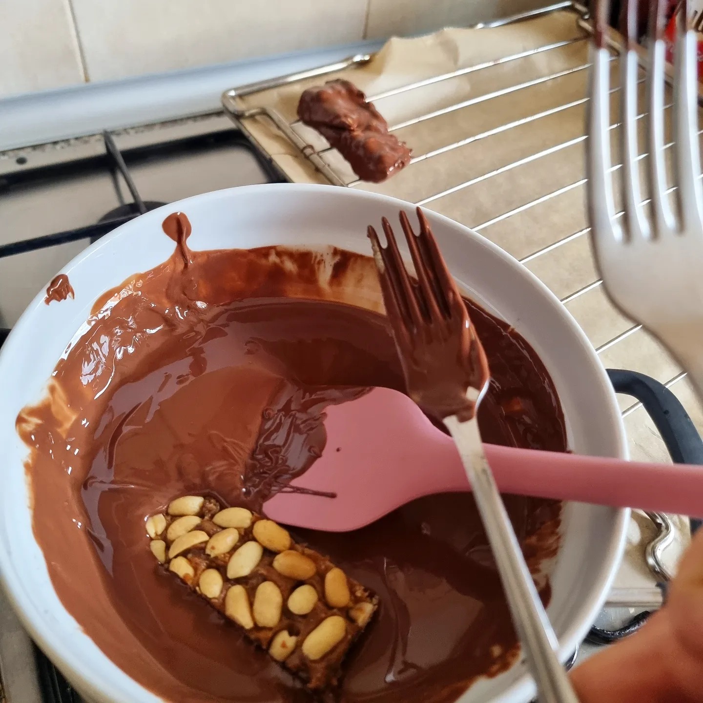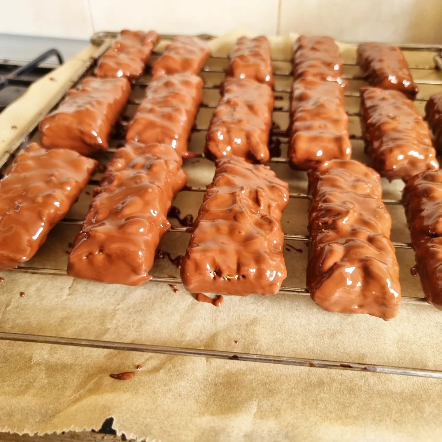 Derreter o chocolate e o óleo de coco em banho maria. Molhar cada uma das barras no chocolate e cobrir completamente. Com ajuda de uma grelha (forno) colocar as barras uma a uma. Colocar no frigorífico e depois de pelo menos 6 horas é aproveitar <3